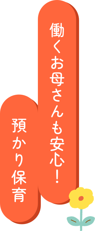 幼稚園でも「働くお母さん」が増えています。「幼稚園に預けたい!でも共働きだから・・」と迷われている方、せひお預かり保育をご利用ください。当園では早朝、保育後、長期休み中も預かり保育を行なっています。また就労の方以外も、ご家庭の事情や学校関係等でいつでもお預かりを利用することができます
